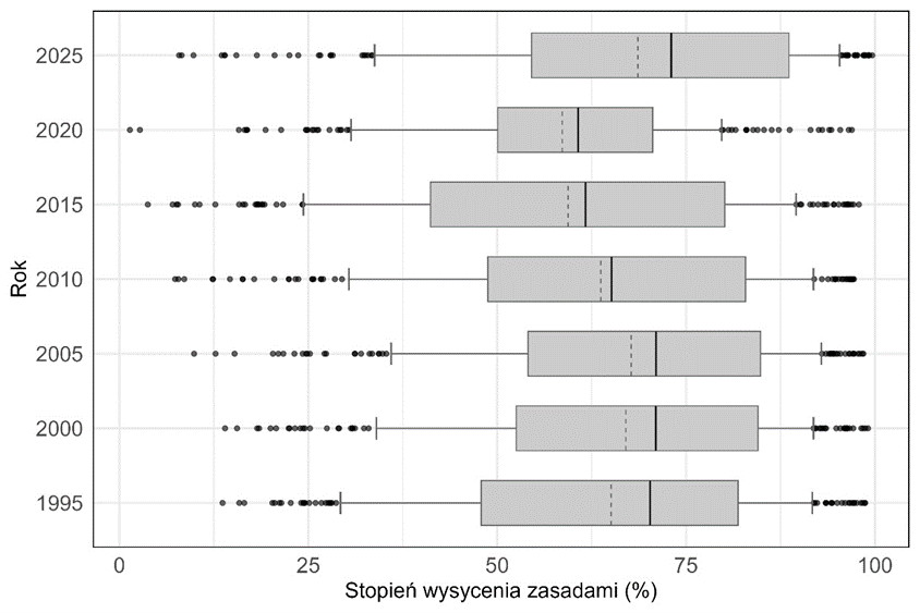 Pojemność sorpcyjna ma podstawowe znaczenie dla możliwości zatrzymywania w wierzchniej warstwie gleby składników z nawozów. Jest to również parametr decydujący o stopniu unieszkodliwiania zanieczyszczeń, takich jak metale śladowe w glebie. Wielkość pojemności sorpcyjnej gleby zależy od jej składu mechanicznego i zawartości próchnicy, jest zatem wartością dość stałą i nie należy spodziewać się dużych zmian tego parametru na przestrzeni lat. W 2025 r. zaobserwowano natomiast korzystne zmiany wskaźnika wysycenia pojemności sorpcyjnej zasadami, którego przeciętna wartość wyniosła 68,6%, co stanowiło powrót do poziomu średnich wartości notowanych w latach 2000 – 2005.