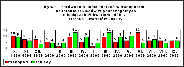 Zdecydowanie najwięcej zdarzeń w transporcie ma miejsce w przewozie drogowym materiałów niebezpiecznych. Analogiczna sytuacja występowała w ciągu trzech kwartałów 2000 r., kiedy ilość zdarzeń w poszczególnych rodzajach transportu wynosiła: